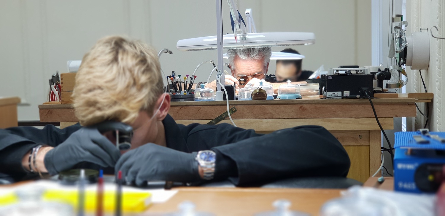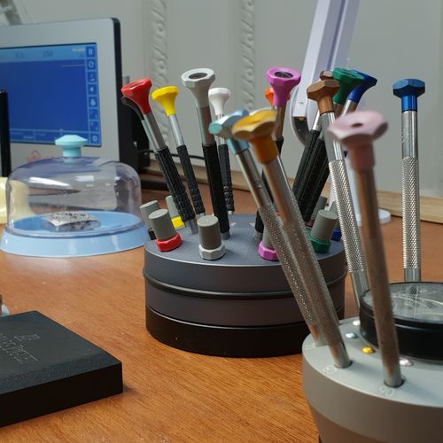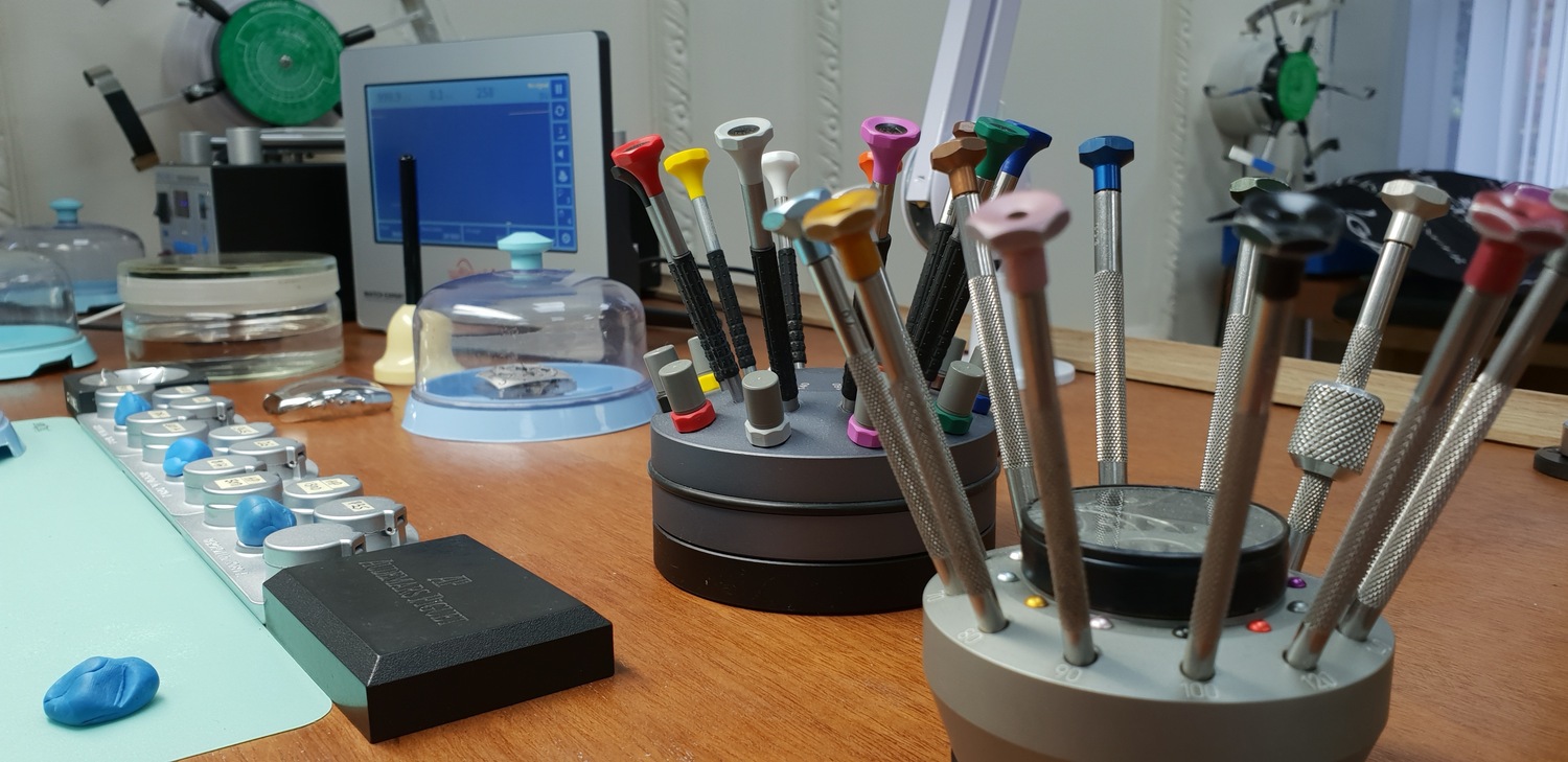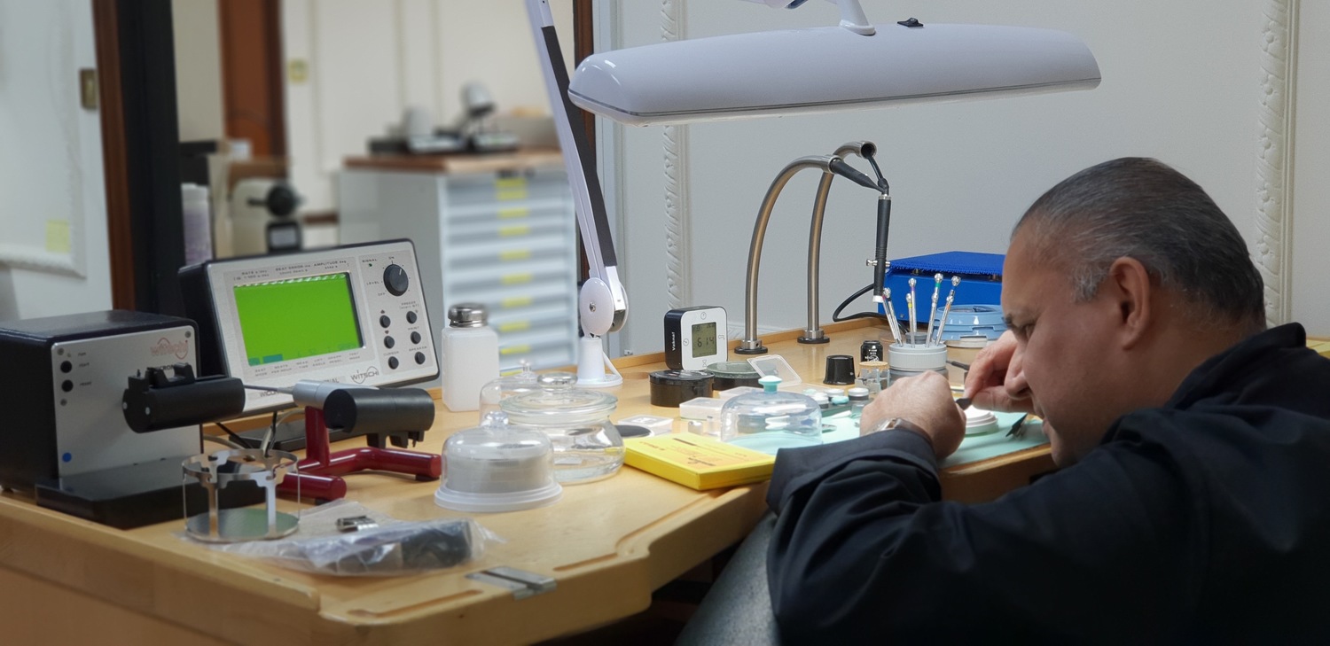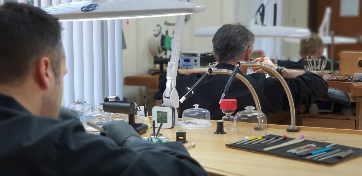 Our bright and modern workshop is fully equipped with the latest horological equipment, machinery and tooling: daylight work lamps illuminate the watchmakers’ benches and our technical assessment and testing areas house equipment such as timing machines, cleaning machines, automatic winders, water resistant testing machines, case-presses, glass presses, bordered by the same brand of steel cabinets used by Formula One teams packed full of parts, glasses, movements, crowns, mainsprings, clasps, bracelets and straps.