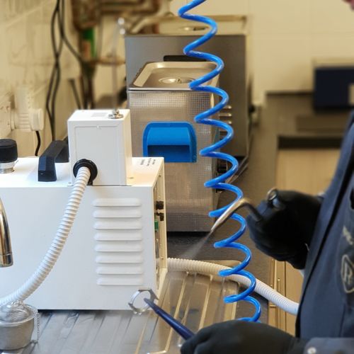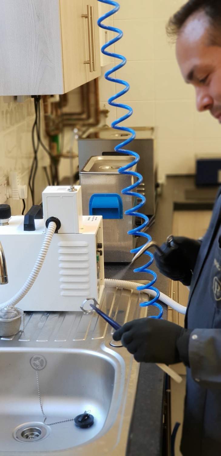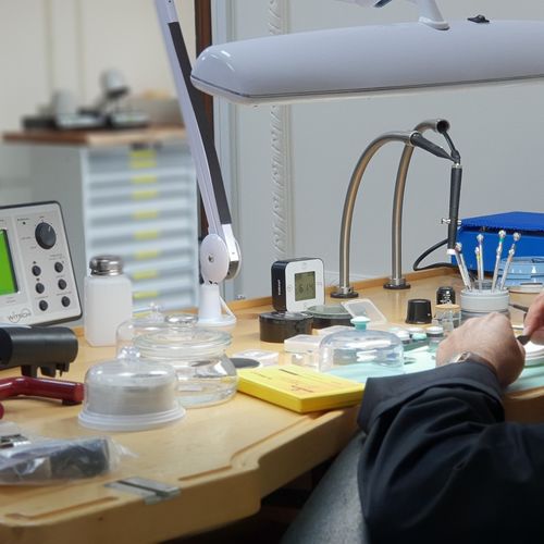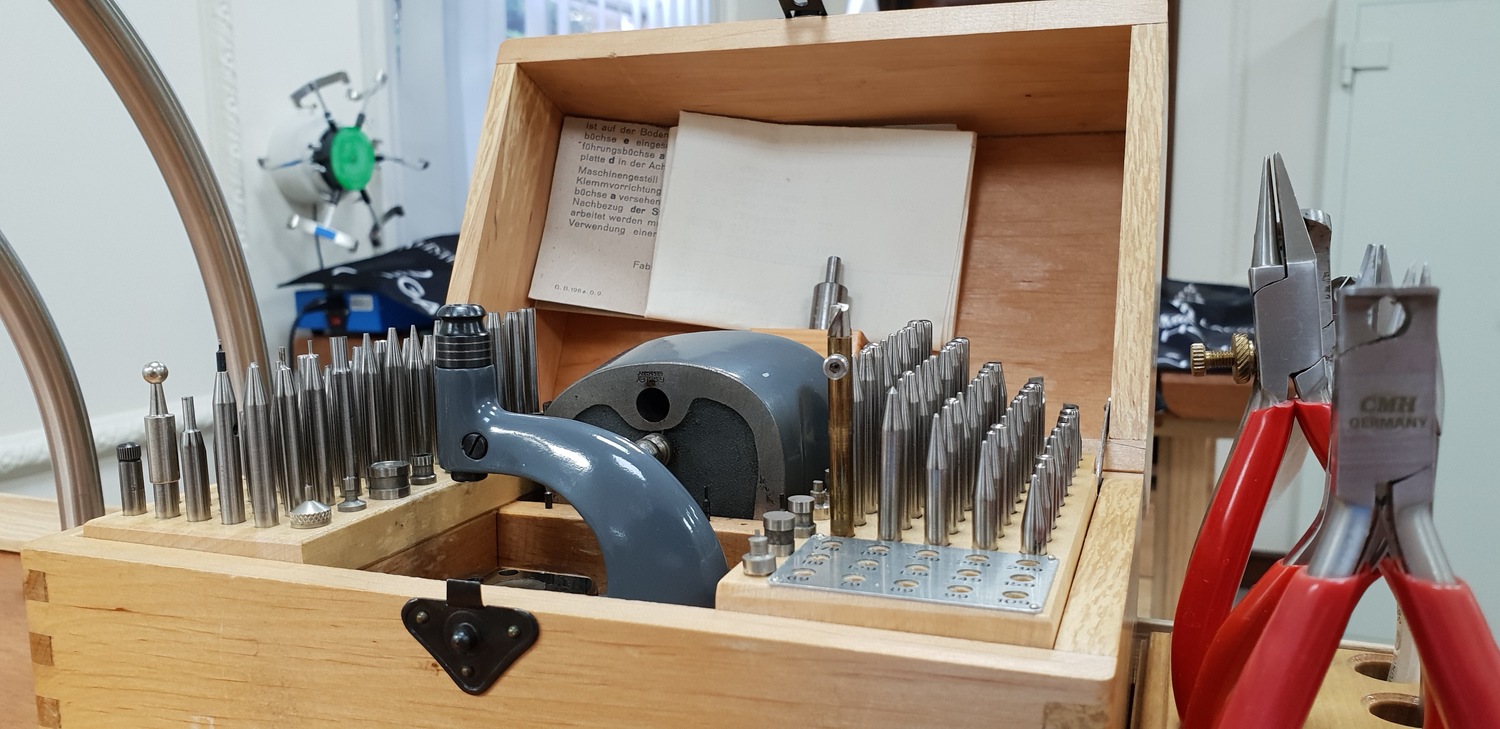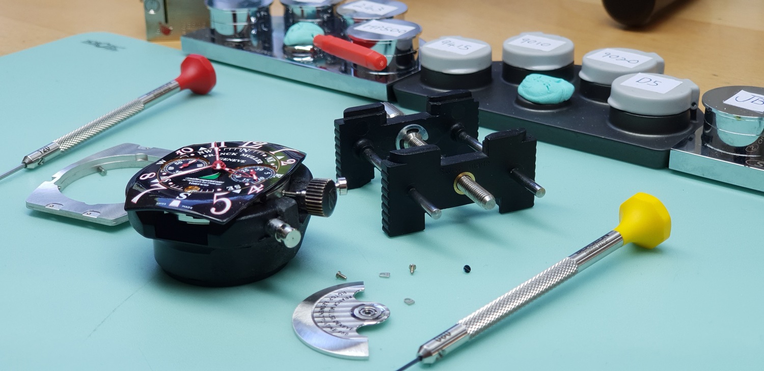 Our bright and modern workshop is fully equipped with the latest horological equipment, machinery and tooling: daylight work lamps illuminate the watchmakers’ benches and our technical assessment and testing areas house equipment such as timing machines, cleaning machines, automatic winders, water resistant testing machines, case-presses, glass presses, bordered by the same brand of steel cabinets used by Formula One teams packed full of parts, glasses, movements, crowns, mainsprings, clasps, bracelets and straps.